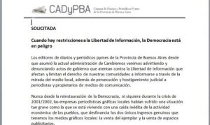 (InfoGEI).- Mediante la publicación de una solicitada, editores de diarios y periódicos pymes de la Provincia de Buenos Aires nucleados en Cadypba, señalan que, desde que asumió la actual administración de Cambiemos “venimos advirtiendo y denunciando actos de gobierno que atentan contra la Libertad de Información que afectan y limitan el derecho de nuestras comunidades a informarse a través de la mirada del medio local, además de persecución y hostigamiento judicial a periodistas y propietarios de medios de comunicación”.