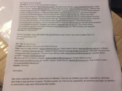 La dirigencia de la Administración Nacional de la Seguridad Social en provincia de Buenos Aires despachó un correo electrónico a sus mandos medios en cada regional para que los mismos le informen “historias de jubilados” con determinadas características para la propagandística del gobierno: -que sean, entre otras cosas, “inspiradoras”, “divertidas” o directamente “defensores del cambio”.-