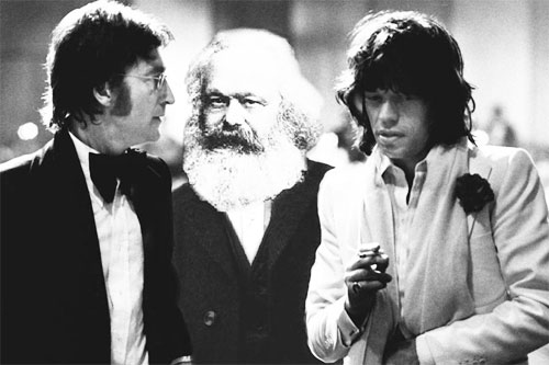 John Lennon y Mike Jagger con Karl Marx, en un taberna de Londres, fecha desconocida