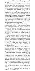 Por último, sostuvo la necesidad de que “nuestro país vuelva a ser un Estado democrático que termine con esta pesadilla que vivimos diariamente junto a nuestras familias y todos los compañeros y amigos que nos aguantan los trapos. Por una Navidad sin presos ni presas politicxs”