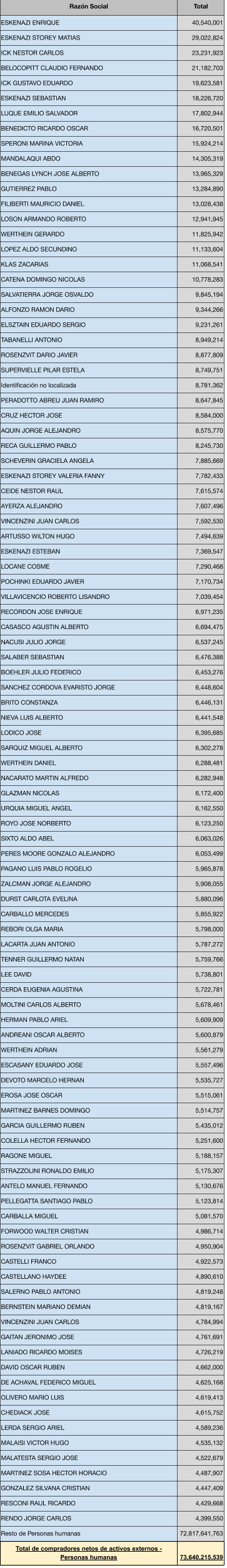 Si se suman todos los miembros de la familia (el hijo Sebastián Eskenazi Storey, con 18,2 millones de dólares; la hija, Valeria Eskenazi Storey, con 7,8 millones de dólares y Esteban Eskenazi, con 7,4 millones de dólares) los Eskenazi sustrajeron a la inversión productiva en el país más de 100 millones de dólares.