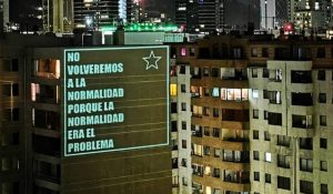 Figura 5. Edificio de Santiago de Chile durante las masivas manifestaciones contra casi 50 años de neoliberalismo, desarrolladas hasta la llegada de la pandemia.
