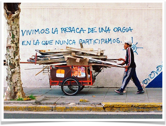 “Vivimos la resaca de una orgía en la que nunca participamos”, reza un muro en la Ciudad de Buenos Aires mientras dos niños caminan por enfrente con su carro de recolección (Figura 1).