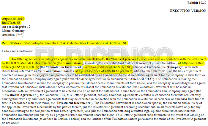 En uno de los apéndices de la carta acuerdo fechada el 30 de agosto de 2019, entre la Fundación de Bill y Melinda Gates y el laboratorio BioNTech, se incluye un apartado denominado “Respuesta pandémica” donde se especifica que si durante los trabajos en curso con la fundación “existiera la necesidad de una respuesta de emergencia a una pandemia por una enfermedad infecciosa, la Fundación puede solicitar a la Compañía (BioNTech) que acepte trabajar en un proyecto financiado vía subvención para dar respuesta a dicha pandemia” pudiendo incluir “el desarrollo de un medicamento, vacuna o diagnóstico“.