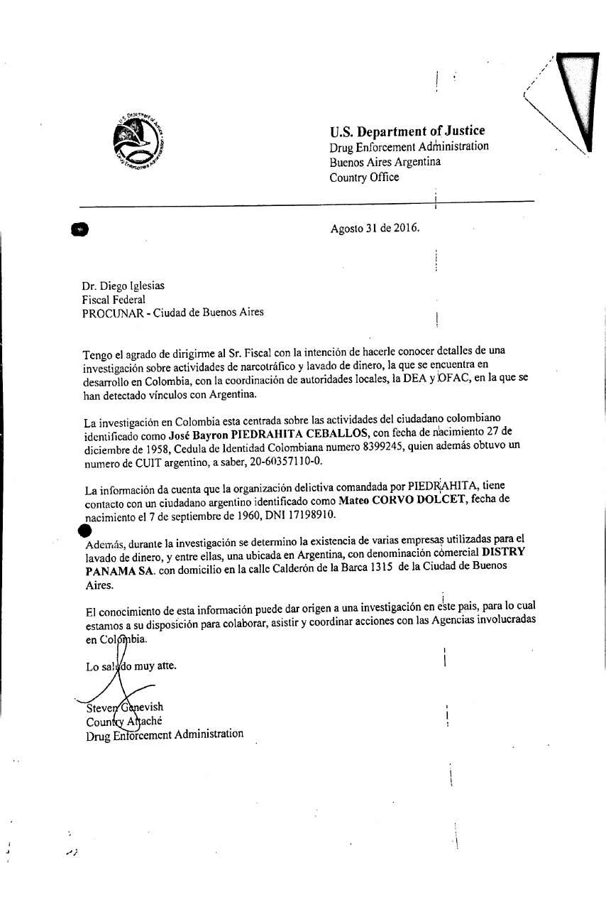 La pesadilla del empresario inmobiliario y abogado penalista Mateo Corvo Dolcet comenzó con un acuerdo de la DEA (organismo del Gobierno de Estados Unidos para el Control de Drogas), con la AFI, el Ministerio de Seguridad de la Nación a cargo de Patricia Bullrich, la UIF y la PROCUNAR –dirigida por el fiscal Diego Iglesias que ahora fue designado por el procurador interino eterno Eduardo Casal en la Cámara de Apelaciones de La Plata-, que tuvo como principal objetivo saldar la situación del narco y mega-empresario ganadero José Bayron Piedrahíta Ceballos –informante de la DEA- ante la Justicia de Estados Unidos y Colombia.