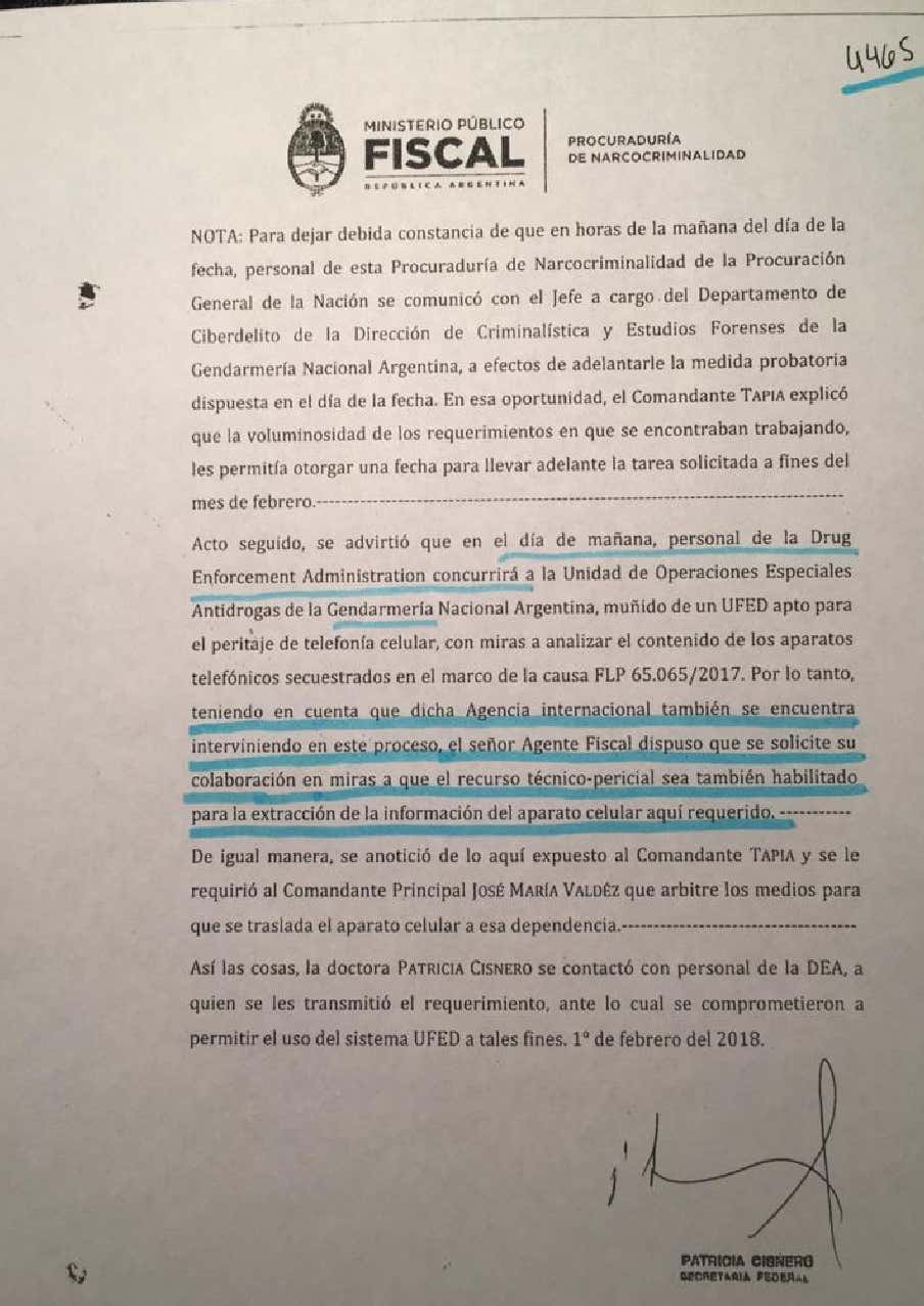 Como si fuese poco, los gendarmes dejaron escrito en el último párrafo: “(…) la DEA procedió a la extracción del equipo de telefonía celular y la tarjeta SIM mediante la herramienta forense UFED 4 PC versión 6.5.0.702 de la empresa CELEBRITE”.