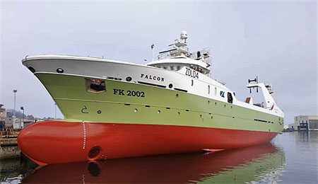 El buque arrastrero F/V Falcon fue lanzado al agua esta semana donde se completará el equipamiento de abordo y se seguirá con las pruebas de navegación.