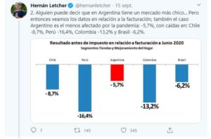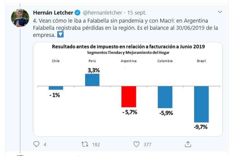 A través de su cuenta de Twitter, el economista Hernán Letcher aseguró que Argentina fue en donde menos cayó Falabella.