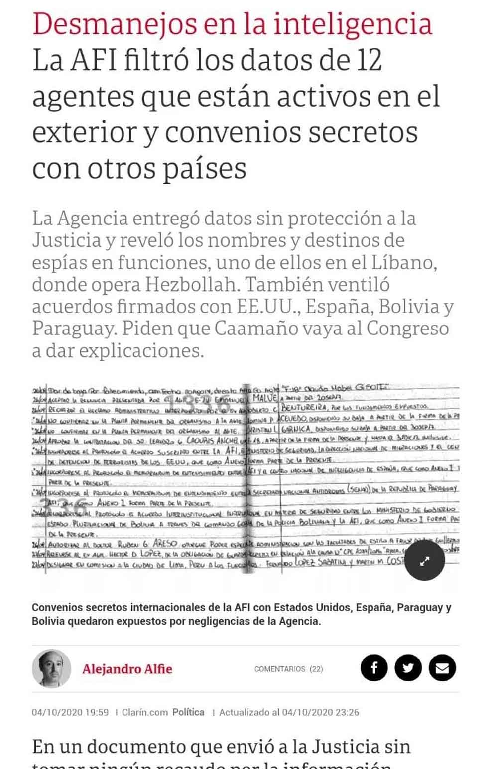 El diario Clarín ofició de vocero de un ataque a El Destape que tiene como objetivo voltear la causa por espionaje ilegal donde se acumulan pruebas que apuntan directo a Mauricio Macri. Se trata de la existencia de una denuncia contra Roberto Navarro, Ari Lijalad y Franco Mizrahi realizada por los diputados macristas Waldo Wolff, Fernando Iglesias, Álvaro de Lamadrid y Jorge Enríquez. La acusación, según Clarín, es por difundir información vinculada a un libro de Actas de la Agencia Federal de Inteligencia (AFI) sin proteger la identidad de los agentes de inteligencia.