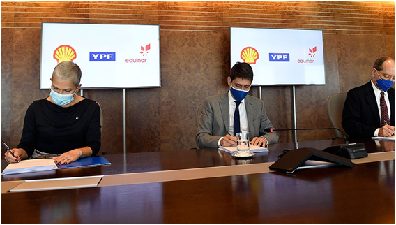 Sergio Afrontti, CEO de YPF, firmando el acuerdo con los presidentes locales de Shell, Sean Rooney, y de Equinor, Nidia Álvarez.