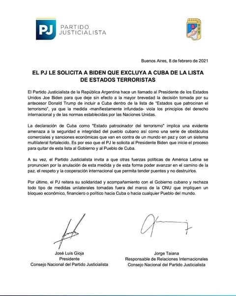 A través de un comunicado el Partido Justicialista le pidió al flamante presidente de los Estados Unidos, Joe Biden, que elimine a Cuba de la lista de estados que patrocinan el terrorismo.