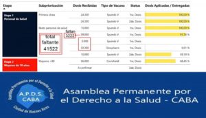Por su parte los profesionales del Hospital Alvear indicaron que con la cantidad de “dosis recibidas se debió vacunar a la totalidad del personal sanitario y quedar un total remanente de 74.735 vacunas para adultos mayores.”