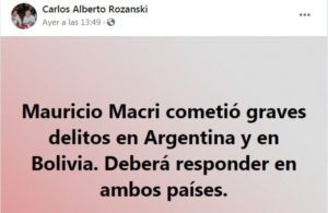 «Macri es un delincuente asustado. Sabe que si vuelve tiene que enfrentar gravísimas causas criminales aquí y en Bolivia y si se profuga, no tendrá tranquilidad.» asevera el otrora juez Rozanski para toda aquella persona que lee sus agudas intervenciones en las redes sociales.