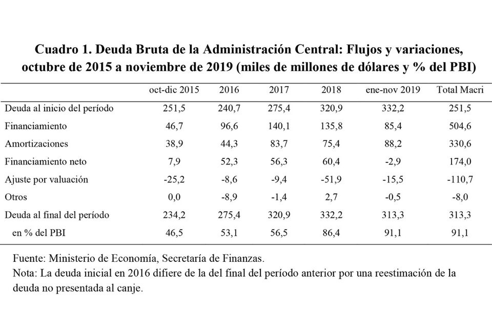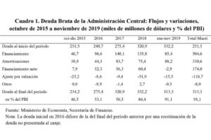 Al 30 de septiembre de 2015, la deuda pública total ascendía a 252 mil millones de dólares, al tipo de cambio de 9,4 pesos por dólar (35 por ciento de esa deuda estaba denominada en pesos). A partir de ese momento, el Gobierno emitió deuda nueva, parte en pesos y parte en dólares: títulos, letras y pagarés del Tesoro, adelantos del BCRA, préstamos de organismos oficiales y multilaterales. El total de ese financiamiento obtenido hasta noviembre de 2019 fue equivalente a 505 mil millones de dólares.