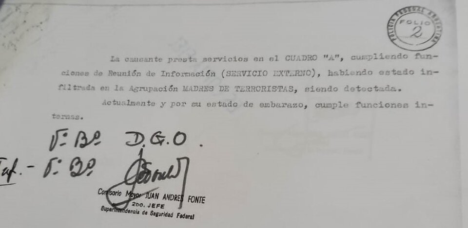 Inmediatamente, en el legajo de la mujer lucía otra certificación que llevaba la firma de Juan Andrés Fonte, el segundo del jefe de la SSF: “La causante presta servicio en el cuadro ‘A’, cumpliendo funciones de Reunión de Información (Servicio Externo), habiendo estado infiltrada en la agrupación MADRES DE TERRORISTAS, siendo detectada.