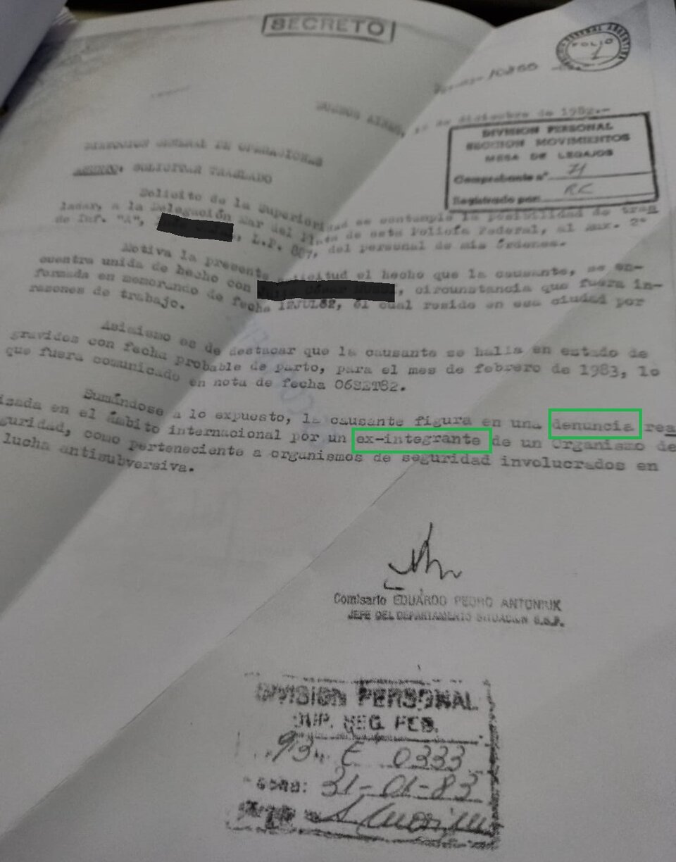 En diciembre de 1982, el comisario Eduardo Pedro Antoniuk les reclamó a los superiores el traslado de la agente que gozaba de una buena reputación dentro del Cuerpo de Informaciones. Antoniuk dio una razón adicional: “La causante figura en una denuncia realizada en el ámbito internacional por un exintegrante de un organismo de seguridad como perteneciente a organismos de seguridad involucrados en la lucha antisubversiva”.