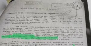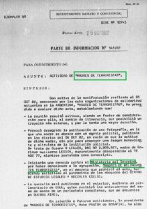 En un informe, los espías decían que la foto causó conmoción al interior del organismo de derechos humanos, pero agregaban un dato más: esa marcha había sido prohibida por el Ministerio del Interior —del que dependía la PFA— y el decreto nombraba a la agrupación como “Madres de delincuentes terroristas”.