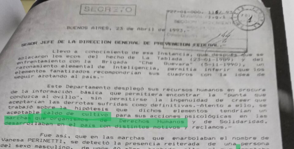 “Se trabajó sobre la hipótesis de que dichos elementos tendrían un aceptable caldo de cultivo para sus acciones psicológicas en las marchas que organismos de derechos humanos y de solidaridad desarrollaban en el país con distintos motivos o reclamos”, continuaba el reporte que dejaba en claro que para los servicios de inteligencia, al igual que en la dictadura, el movimiento de derechos humanos se presentaba como un enemigo al que temer y espiar.