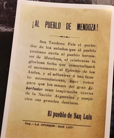 El texto decía: «¡Al pueblo de Mendoza!, Sea Teodoro Fels el portador de los saludos que el pueblo puntano envía al pueblo hermano de Mendoza, al celebrarse la gloriosa fecha que inmortalizara el monumento al Ejército de Los Andes y al adherirse a tan fausto acontecimiento, hace votos para los manes del gran Libertador, sean inspiración eterna de la Nación Argentina y auspicien sus grandes destinos. El Pueblo de San Luis». Esta original idea dejó atónitos a los mendocinos.