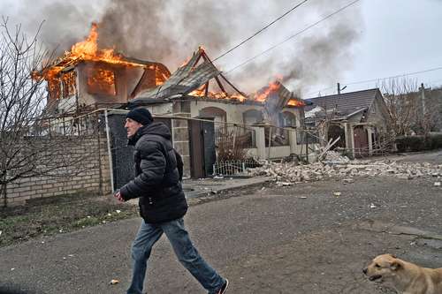 [En la imagen, un residente pasa junto a una casa en llamas bombardeada por los rusos el viernes pasado, en Jersón, Ucrania.