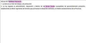 En la nueva redacción el artículo es el 94 y en su inciso número 1 establece que «la tierra es un bien de trabajo y producción»; mientras que en el número 2 establece que la ley regulará «la administración, disposición y destino de las tierras fiscales susceptibles de aprovechamiento productivo (…)»