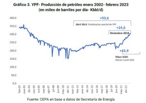 Como se observa en el gráfico a continuación, la producción de petróleo registró una declinación sostenida desde fines de la década del ‘90 hasta 2012, año en que se estatizó el 51% de las acciones de YPF.