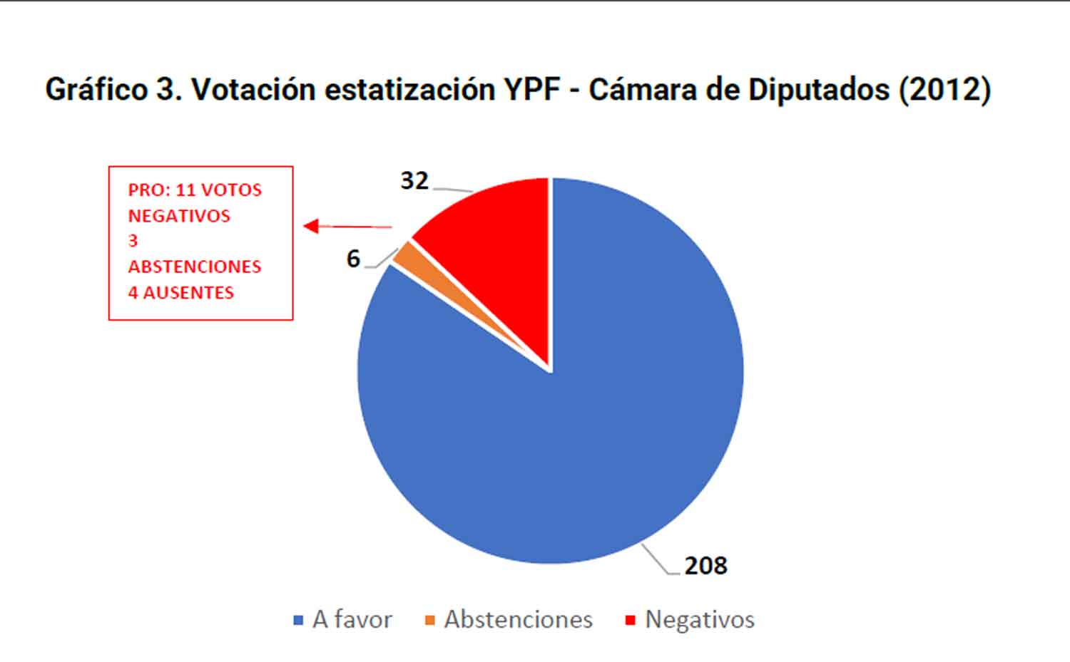 La Cámara de Diputados sancionó en 2012 la ley de expropiación de YPF, con 208 votos a favor, 32 en contra, 6 abstenciones y 11 ausentes.