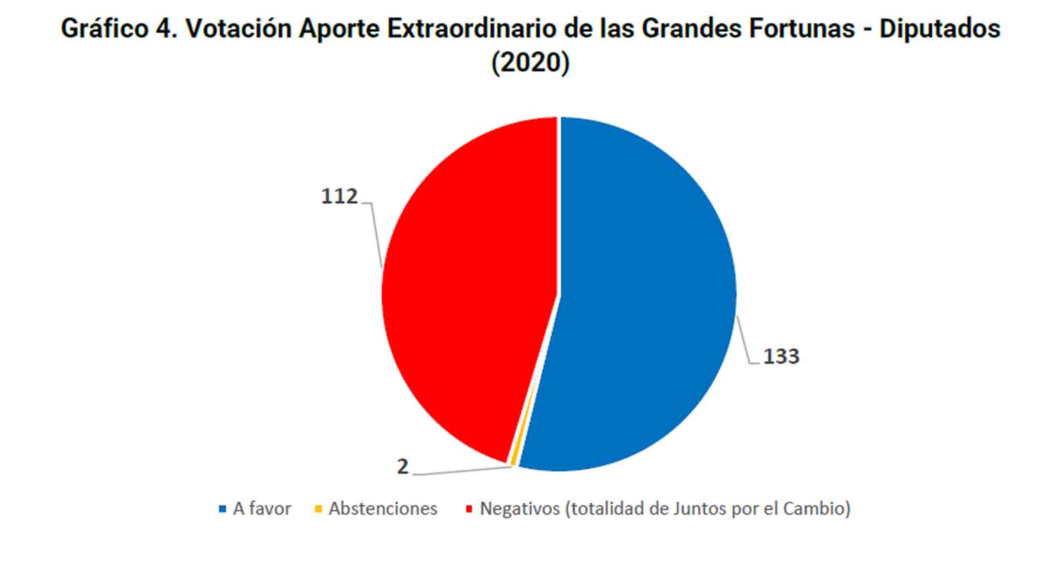 En la votación de la ley del Aporte Solidario y Extraordinario de Grandes Fortunas en 2020, el oficialismo alcanzó, en la Cámara de Diputados, un total de 133 votos positivos, mientras que 112 diputados, todos pertenecientes a lo que hoy es Juntos por el Cambio, se encolumnaron en el rechazo, acusando de “confiscatorio” el proyecto.