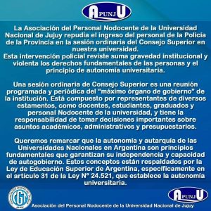 El Consejo Superior de la Universidad Nacional de Jujuy estaba dando por terminada la sesión ordinaria, en la que elaboraban un antiproyecto en rechazo de la reforma de Morales, cuando irrumpieron en el establecimiento efectivos policiales, sin autorización y de manera arbitraria. También, luego de denunciar lo ocurrido, fue detenido un docente.
