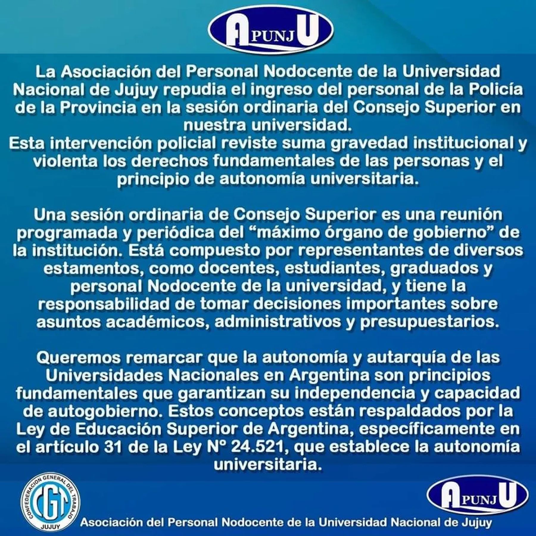 La irrupción se produjo mientras se desarrollaba una sesión del Consejo Superior, que desde la Asociación del Personal no docente de la Universidad Nacional de Jujuy (APUNJu), explicaron que: