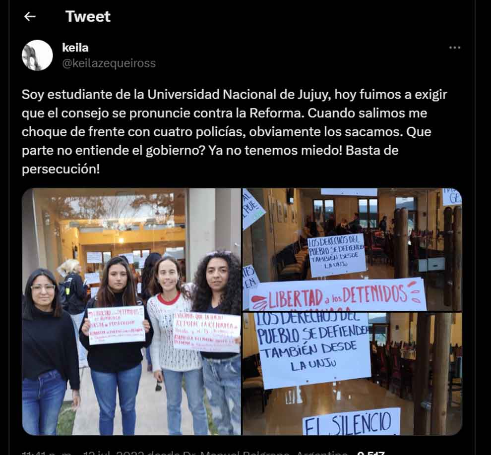 “Estábamos en una sesión del Concejo Superior de la Universidad junto con docentes de ADINJu y alumnos de la universidad presentando un anteproyecto para declarar un órgano en repudio de la constitución y que se presenten como querellantes en las causas contra docentes y alumnos de la UNJu y que se expidan sobre toda la situación en la provincia.