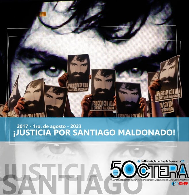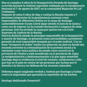 A 6 años de la Desaparición Forzada de Santiago Maldonado ocurrida durante la violenta represión realizada por la Gendarmería Nacional el 1° de agosto de 2017 en la comunidad Mapuche Pu Lof Cushamen.