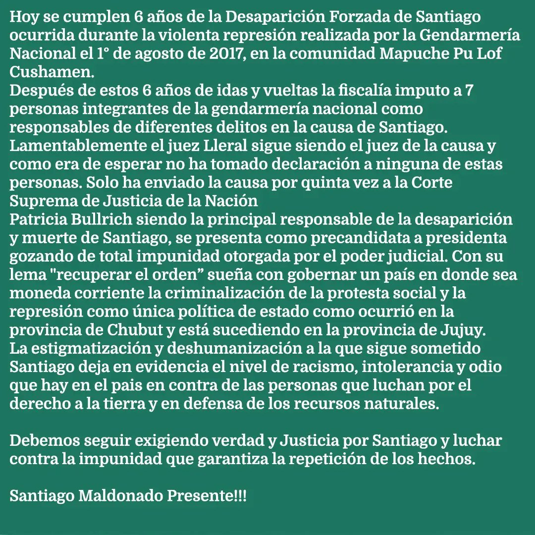 A 6 años de la desaparición seguida de muerte de Santiago Maldonado, seguimos pidiendo justicia.