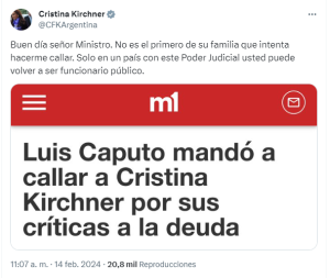 Cristina Kirchner le contestó de manera contundente al ministro de Economía, Luis Caputo, quien atacó a la expresidenta y la mandó a callar tras el extenso documento que hizo público este miércoles a través de sus redes sociales.