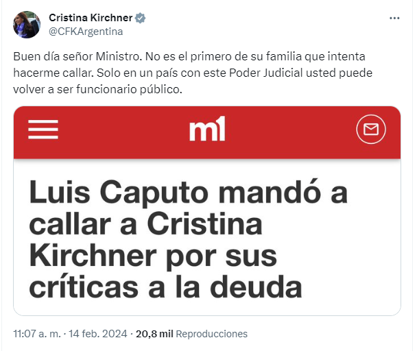El cruce llegó después de que esta mañana la expresidenta publicara un largo ensayo en sus redes sociales sobre el “estado de situación” del país y una nueva crisis de deuda que impacta sobre el pueblo tras la asunción de Javier Milei.