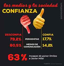 Cuando se le preguntó a los encuestados sobre la confianza en las instituciones de la Argentina, un 80,5% contestó tener “desconfianza” en los medios de comunicación y tan sólo un 14,2% manifestó poseer “confianza” en ellos, mientras que un 5,2% dijo no saber.