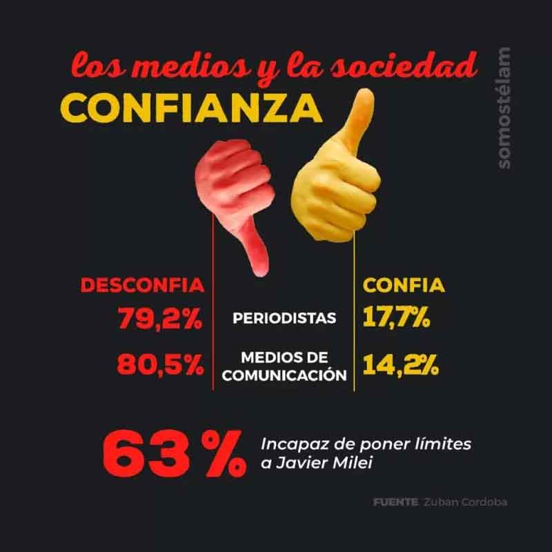 Más del 80% de la sociedad no confía en los medios de comunicación y se les otorga una gran “incapacidad” para ponerle límites al gobierno de Javier Milei, según la encuesta “La tensa estabilidad de la Argentina libertaria” realizada por la consultora Zubán Córdoba y Asociados.
